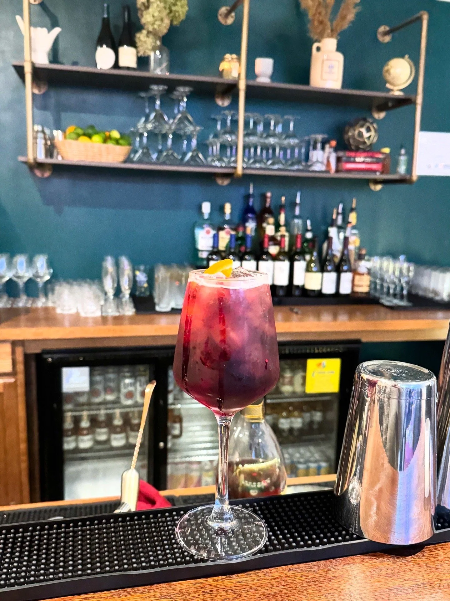 A colorful cocktail garnished with lemon on a bar countertop with liquor bottles, glasses, and bar equipment in the background.